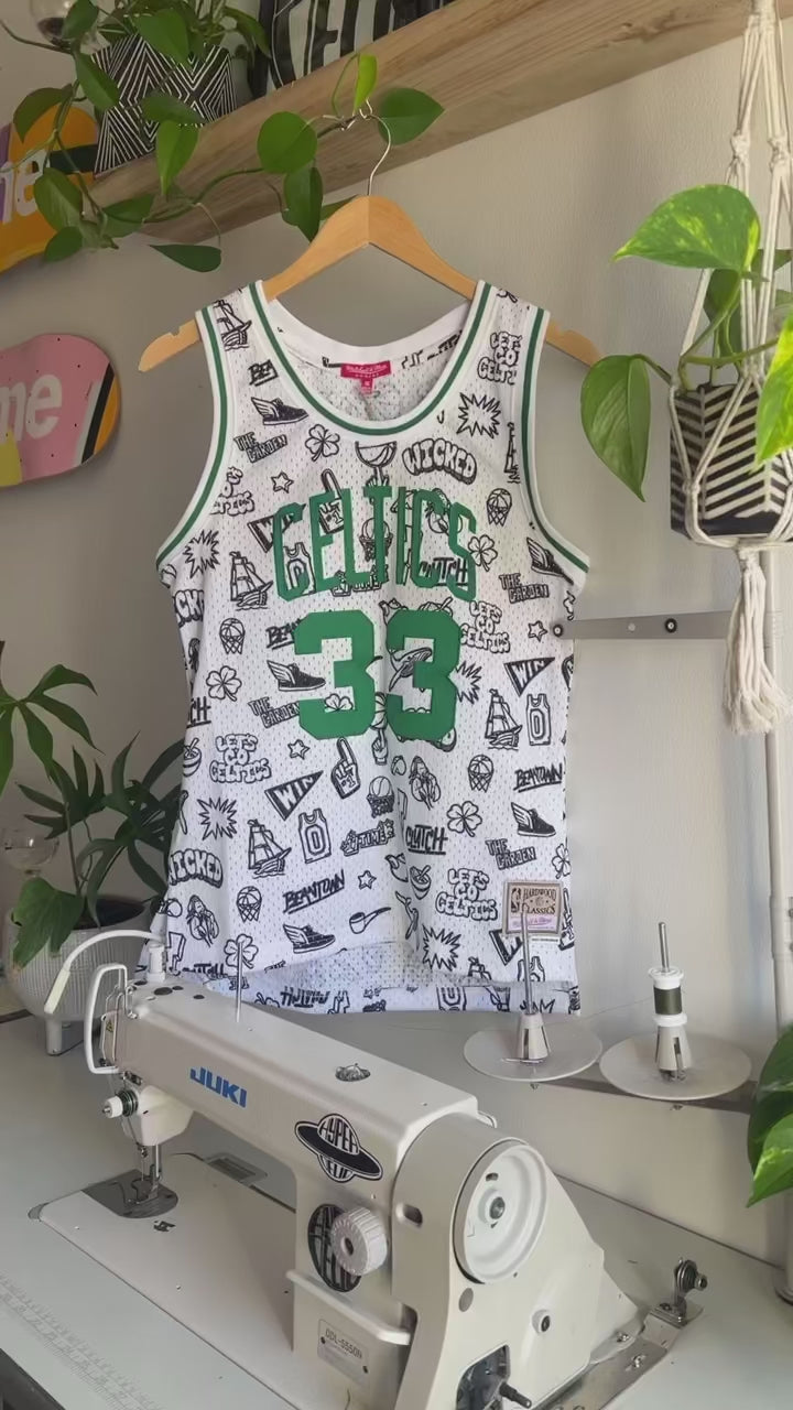 This Upcycling 5 Panel Hat is handmade with a unique white and green Mitchell and Ness Hardwood Classic Boston Celtics Number 33 Larry Bird Jersey, with Boston MA. sketches all over the jersey. "Let's Go Celtics, four leaf clover's, clam chowder bowls and more.