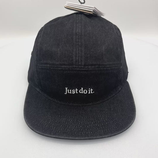 The soft washed denim of this cap is embroidered with a "Just Do It" emblem. Fly 5 Panel Caps all have a snug and athletic fit with a low depth.